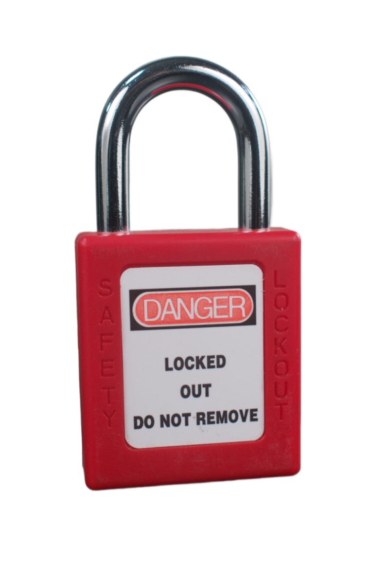 A durable, non-conductive safety padlock designed for lockout/tagout (LOTO) applications. Made from high-quality insulated materials, it prevents electrical hazards and ensures safe energy isolation. Keyed to differ for individual security, with a key-retaining feature to prevent key removal when unlocked. Lightweight yet strong, ideal for industrial and electrical safety compliance. Red color for high visibility.